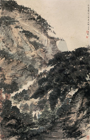 此幅《幽谷话旧》体现了傅抱石四十年代中期笔下屡见处理手法。此画用破笔散锋入纸,笔尖、笔肚、笔根同时作用,快速地横涂竖抹,循环往复,浓淡互破,虚实相生,又以饱和而充足的水分,大块面地用墨衍色,使之水乳交融,生机勃勃,元气淋漓,与滋润多雨、雾气弥漫、潮湿深厚、植被丰茂的蜀地山水黯然吻合。图中布局严谨,左上角山坡陡峭、如遭斧削,有小路呈“之”字型沿山坡而辟。右下方老树横伸而出,枝叶茂密,两者如犄角相峙,画面自生均衡之势。画面细节讲究,无论岩块、绿竹、红树,穿插层叠,安排密而不乱,井然有序。傅抱石在最稠密的地方以留白腾出空间,置两高士聚首其中,相晤幽谷,闻话于林荫深处,有遗世忘机之感,也是画家当下心境寄托之写照。画中主体凸现出来,显隐对比,妙趣横生!