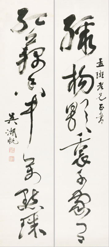 提起吴湖帆的书法和绘画艺术,很多 人首先产生的感觉是清新淡雅。假使以狂放 豪迈来给吴湖帆的书画下定义,相信很多人 都会大加反驳。诚然,一个艺术家的艺术创 作会遵循一个自己的风格向前发展,基本上 是成定式的。然而除此之外,艺术家往往会 在探索的过程中旁涉他家,体验与惯常不一 样的艺术感受,从而迸射出更绚烂的艺术火 花。譬如这幅草书联,一改吴湖帆往昔平静 淡雅的风格。众所周知,吴湖帆在其中年时 期曾致力于怀素狂草的研习,从这幅对联上 我们依稀可以辨识出怀素的面貌,这偶尔一 现的灵感并非随时随地都能捕捉的到的,也 正因如此,才更体现出此类草书作品的珍贵。