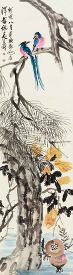 佛手、石榴、寿桃为中国传统的三多,寓意吉祥,此幅近6尺高的画作以一对绶带鸟代替寿桃,取意相同,而使画面更为丰富生动,更配以象征长青的苍松,吉祥之意满溢于画。