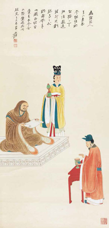 此件《石勒问佛图》未署年款,属大千敦煌归来时的作品。从敦煌回来后,他的人物画风格大变,画的线条虽不改其秀丽但益趋圆劲,设色虽绚丽而不失清雅明净,是吸取敦煌壁画营养以后的新境界。从《石勒问佛图》落款可以知道此作画风本源,大千虽自谓系拟仿钱选,但其所到达之境地已力追唐宋高古,又非钱选之所能及。张大千已将钱舜举胸蕴了然于心,下笔超脱自在而游刃有余。