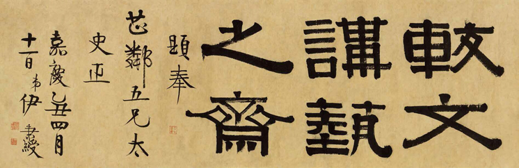 在学问和艺术上,伊秉绶得到纪晓岚和刘墉的亲授,天赋加勤奋,使伊秉绶很快有了诗、书、画“三绝”的美誉。然而伊秉绶痴痴以求的东西,似乎还在更为高远之处。谢章铤《睹棋山庄诗话》载:“墨卿每朝起学笔画数十百圈,自小累大,至匀圆为度。盖谓能是,则作书腕自健。”焦遁《雕菰楼集》谓“公之起居言笑,蔼然君子儒也。时濡墨作隶书,如汉魏人旧 迹。”从现存的秉绶墨迹中可以看到,伊公临写的《衡方碑》(《伊秉绶书法大观》第193页)、《张迁碑》(《大观》第76页)、《裴嶔纪功碑》(《大观》第77页)、《韩仁碑》(《大观》第79页)、《受禅碑》(《大观》第66页)、《五凤等字刻石》(《大观》第 135页)都能深得精神气魄,可见其用功之深。何绍基《东洲草堂诗抄》赞伊秉绶:“丈人八分出二篆,使墨如漆楮如简。行草亦无唐后法,悬崖溜雨驰荒藓。不将俗书薄文清,觑破天真关道眼。”伊秉绶学刘墉而得其浑厚,学鲁公而得其刚正,学汉隶而得其静穆高古,最后脱胎换骨,独树一帜,创立了这种富含精神力量的伊氏隶书,在整个书法史上奇 峰耸立。沙孟海先生说伊秉绶“落笔就和别人分出仙凡的境界”,这正是伊氏隶书独具魅力的原因所在。在此幅作品中,伊秉绶隶书平正与奇肆相辅,张扬与朴实相融,整齐与参差相嵌,光洁与迟涩结合,构成了充实宽博,气势宏大的阳刚之美。