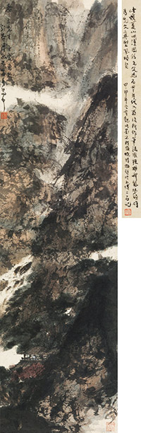 抗战期间,傅抱石自1939年入蜀寓居重庆西郊金刚坡下,羁留川东前后八载。在这八年里,画家以超常的勤奋和无限的热情,成功地找到了自己独特的艺术语言,以前无古人的“抱石皴”令画坛为之一振。傅抱石曾自己说:“画山水的在四川若没有感动,实在是辜负了四川的山水……以金刚坡为中心周围数十里我常跑的地方,确是好景说不尽。一草一木,一丘一壑,随处都是画人的粉本。烟笼雾锁,苍茫雄奇,这境界是沉缅于东南的人所没有、所不敢有的。”在这段时间里,他经常落款“东川金刚坡下”。长期以来,这批金刚坡时期的作品一直被视为傅抱石一生创作中最重要的部分。 此幅《夏山听瀑》是难得一见的落拓大幅,狭长高旷,表现唐人诗意,更多的还是蜀中山水秀美的景致,堪称画家这一时期的代表作。初到重庆时,由于傅抱石长期以来在美术史方面的著述,许多人都以为他根本不会画画。这时的傅抱石虽然也曾在南昌举办过画展,但确实平素不愿将作品示人。面对川东的山山水水,傅抱石在苦苦酝酿着画风的转型。他在《壬午重庆画展自序》中写到:“成渝古道旁,金刚坡麓的一个极小的院子里原来是做门房的,用稀疏竹篱隔作两间,每间只有不过方丈大……写一封信,已够不便,哪里还能作画?不得已,只有当吃完早饭后,把仅有的一张方木桌,抬靠大门放着,利用门外照来的光线作画。画后,又把方木桌抬回原处吃饭,或作别的用途。”就是在这样艰苦的环境下,傅抱石在“壬午个展”拿出了近百幅作品,并受到徐悲鸿、郭沫若、宗白华等的热情赞扬。对傅抱石来说,1942年的“壬午个展”是一次成功的艺术宣言,不仅让其画名大振,更关键是让其在“抱石皴”的探索完善上坚定了信心。此幅《夏山听瀑》尽得天地苍茫雄浑之概,极富“纪念碑式”山水的宏伟气质。在画面上可以观赏到先生运用了传统皴法中最不规律、最自由、也是最洒脱的两种—“乱柴皴”和“乱麻皴”,并加倍的用水晕染。在此之外,傅抱石不断探索自然的新法,以“破笔散峰”表现山石纹理以及峰峦结构。此举拓展了中国画用笔的表现范围,在山水皴法上无疑是一个重大发展,形成了留名后世的“抱石皴”。正是这样具有强烈个人风格的艺术风貌,形成了颇为藏家看重的“金刚风韵”。