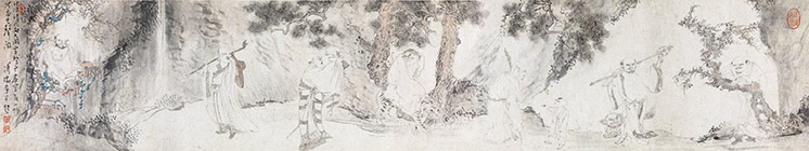 是幅绘山石松藤间的罗汉七人:起首的沉思罗汉,俯凭在一株折腰老树上,双手交叠,右手握一莲花权杖,正双目微睁,颔首冥想;第二位笑狮罗汉袒胸露腹,目光如炬,右手持锡杖担于肩上,左手剑指侧前方,一只狮子伏于其身后;第三位欢喜罗汉扶杖佝偻而立,笑眯眯地面对手托红果的小童;第四位耳穿银环,骑虎前行的则是伏虎罗汉,背后两株苍虬古松,松荫遮天蔽日;第五位看门罗汉身披海马纹刺绣袈裟,左手持杖,杖头系一书卷,右臂高举,摇铃化缘;接下来一位身披斗篷,荷杖挂笠的则是过江罗汉;最后一位静坐罗汉结半跏趺坐,面目安详,倚坐在古藤上,身旁置一钵盂。七位罗汉俱是胡貌梵相,情态各异,绝逸出尘。 画中人物刻画纯用白描笔法,补景的山石、松树以墨笔皴擦,唯藤叶、松干、果子等略染以石青、赭石、朱砂等色彩,清净肃穆。高古的游丝描圆匀遒劲,折带描则爽快利落,这皆得力于溥心畬深厚的书法功底,尽现罗汉袍服柔软飘逸之态,发须细韧蓬松之状。此幅罗汉的形象与今传李公麟的《维摩演教图》中的僧侣样貌极为相似,而溥心畬在另一幅1947年的《罗汉图》题识中言“临李公麟笔”,故此幅亦应仿自李公麟,或有李氏旧本,惜今不见。 溥心畬一生与佛教结缘甚深,道释画是其重要的创作题材,如达摩、无量寿佛等,多采用具有禅宗意味的写意画风,而白描作品则通常是带着虔敬之心而作,他纪念生母项太夫人的观世音菩萨便必是用白描法绘成。罗汉是驻世不涅的圣者,宋以后日益受到民众尊奉。溥心畬笔下的罗汉既是对平安的祈求,也是高洁品行的外化。是幅以白描绘罗汉,刻画细腻入微,可见其严谨谦恭的态度,在溥氏作品里洵属难得,其人物众多、风格雅致、布局紧密等特点,几乎不见于溥心畬其它的传世画作之中。 此作“缕烟前雾”、“雁在秋天”两印都较少使用,今见的“缕烟前雾”一印多钤于1946年左右在南京期间的作品上。溥心畬于1946年秋、1947年秋两度南游,第二次南游历经南京、杭州、上海等地,最后转道舟山去了台湾。是卷树石、书法均属四十年代风格,而“雁在秋天”或正暗含南去之意,故推断此作亦应为四十年代中后期南游时的作品。