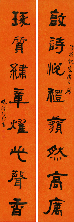 在他的此幅隶书作品中,多使用了篆书的圆笔笔法。篆书作品中又融入隶书的方折笔法。形成呈现出篆隶互融的古拙朴茂之趣,也是他书法最具有特色的一环。正是这样对隶书精髓的准确把握,才能够自然的移入其篆体创作中。同时,由于其重视篆分,勤练不辍,篆意才得以在其隶书中体现。这也体现了其在书法上融会贯通的本领,继邓石如、尹秉绶之后,为清代碑派书法又开辟了一种崭新气象。