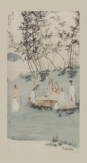 "商山四皓、睢阳五老、竹溪六逸、竹林七贤、饮中八仙、香山九老"等高士题材一直以来都是中国传统文化与传统文人的一个经典而理想的话题。其中,"竹溪六逸"的故事尤为历代文人所偏爱。 据《新唐书·文艺传·李白》记载,开元二十五年(737年),李白移家东鲁,与山东名士孔巢文、韩准、裴政、张叔明、陶沔在泰安府徂徕山下的竹溪隐居,终日酣歌纵酒,激情诗词,赏鉴古玩,挥毫作画,时号"竹溪六逸"。后人省称为"竹谿",并以此典故隐喻一种悠然自在的文化态度和理想而浪漫的生活方式。